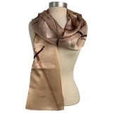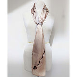 Beige and brown scarf with an abstract photograph printed on charmeuse fabric.