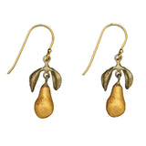 Materials: The golden pear earrings are cast in hand patinated bronze and accented with 24kt gold powder coated cast glass pears. The wires are 925 silver with a 24kt gold plating.