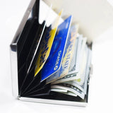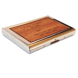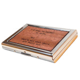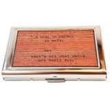 These hand-cut Card Wallets are made of steel and finished with real Mahogany wood. The wood is hand-cut, then bordered in waterproof blank ink. The wood is then typed through a vintage typewriter. These cases fit about 15x business cards, or about 7-8 Credit Cards in the accordion insert (it spreads the cards out so they don't fall out and are easy to pick). These cases are RFID Blocking to make it harder for hackers to steal your identity and data. Good for traveling, very thin and discreet, so it fits comfortably in your pocket.