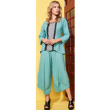 Flowy comfortable striped turquoise pants featuring a sharp angular detail and falling just above the ankle. Elastic waist.